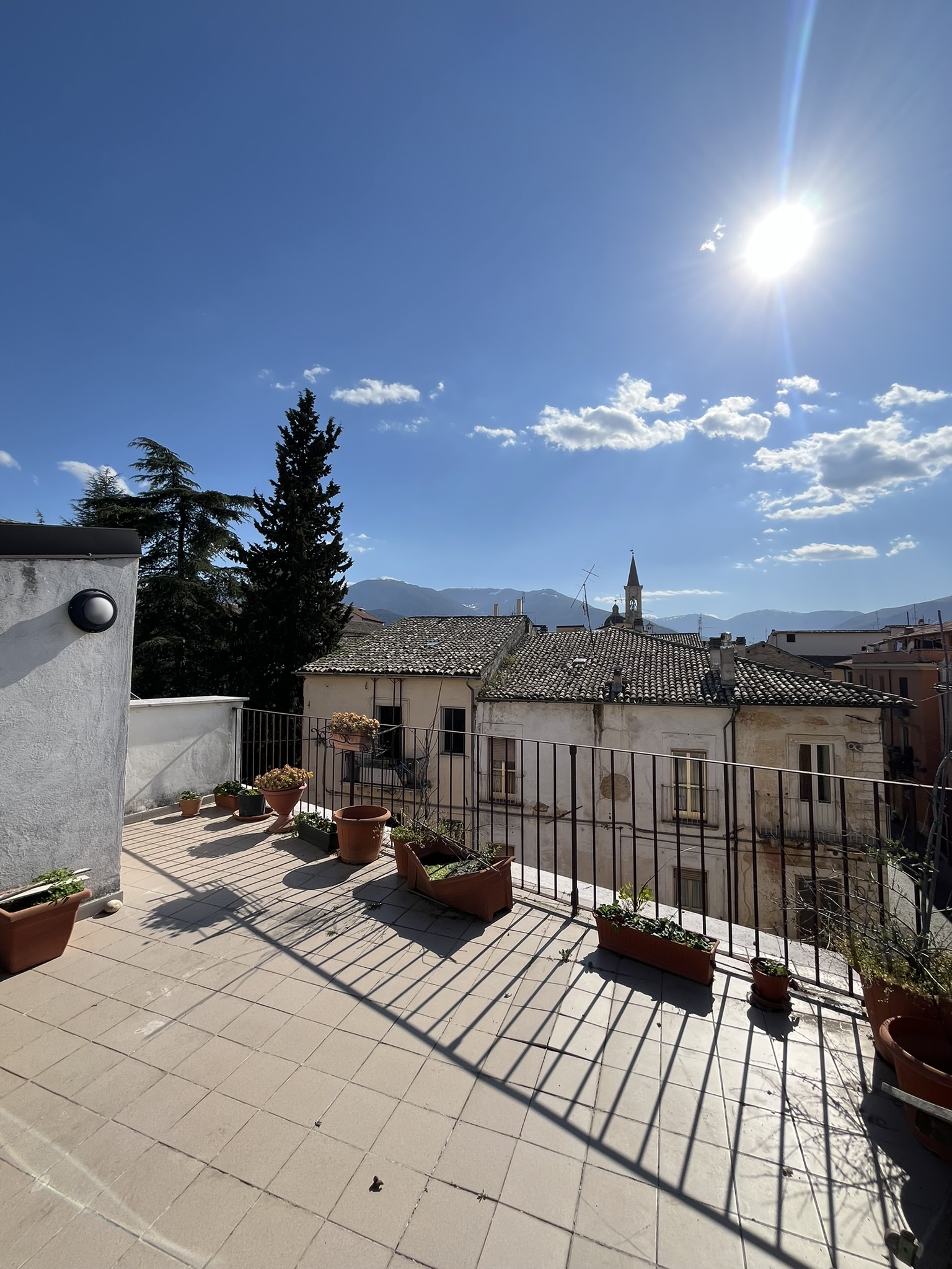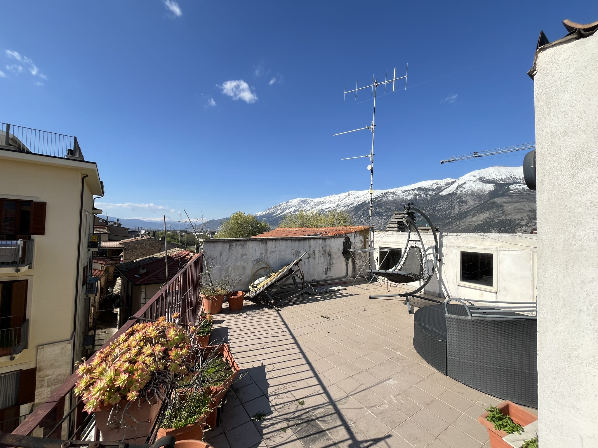 Sulmona, appartamento con terrazza panoramica. Piano secondo soggiorno, cucina con camino, due camere, bagno, terrazza con ripostiglio e garage.